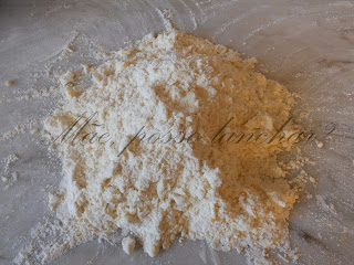 Com a ponta dos dedos, esfarelar a manteiga com a farinha, e depois, pegar na mistura de ingredientes, esfregar um pouco entre as mãos ( a farinha vai soltar-se entre os dedos e a mistura vai ficar pouco a pouco com uma consistência mais grossa).